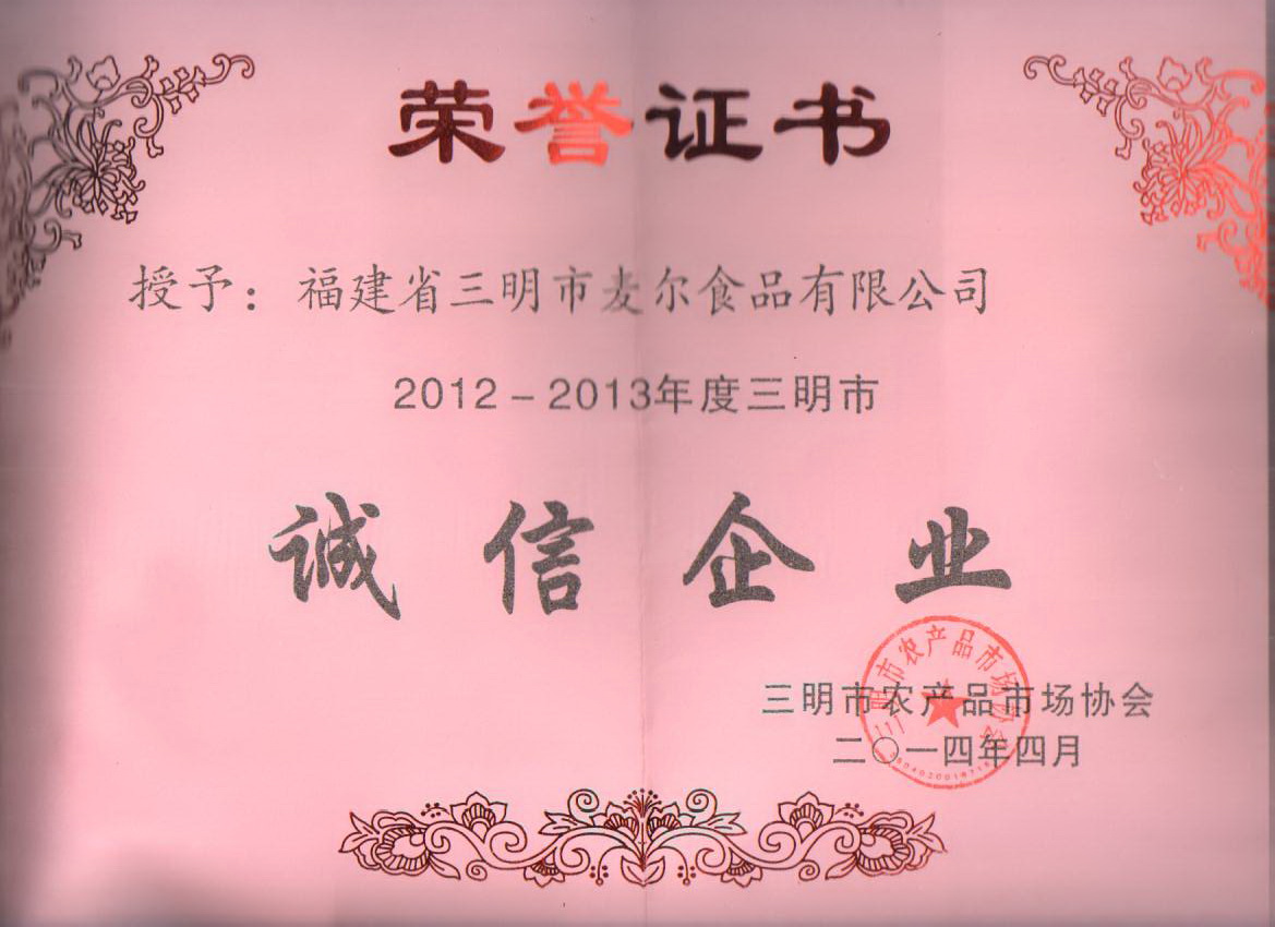 2014年9月12日,從三明市農(nóng)產(chǎn)品市場(chǎng)協(xié)會(huì)得知,公司被授予“2012~2013年度誠(chéng)信企業(yè)”稱號(hào)。